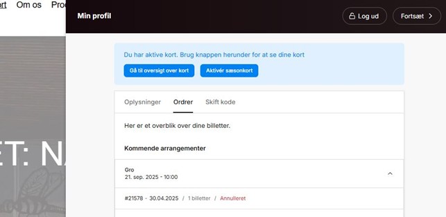 Du kan fortsat se billetten under ’Ordrer’, men med en markering af, at billetten er annulleret: